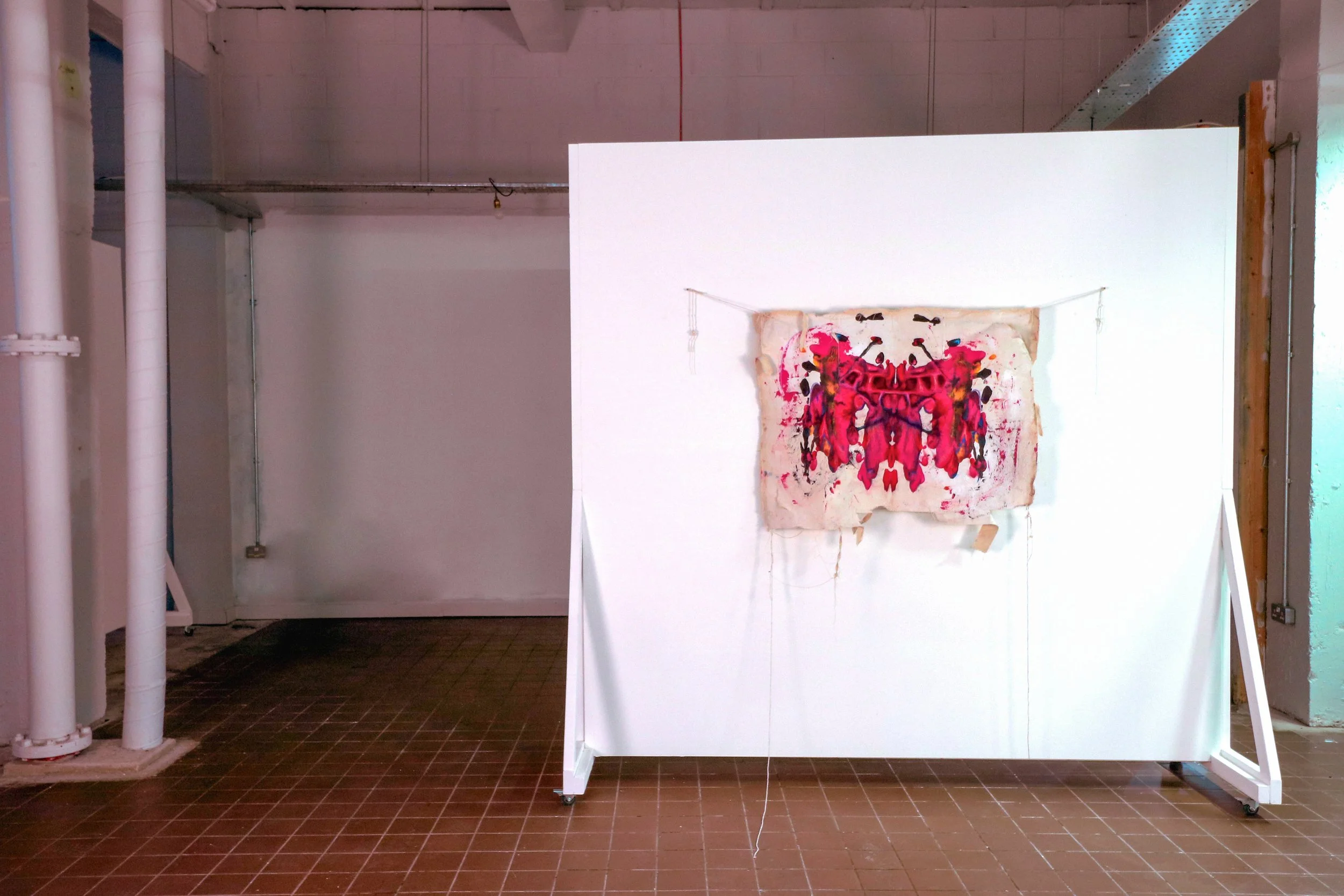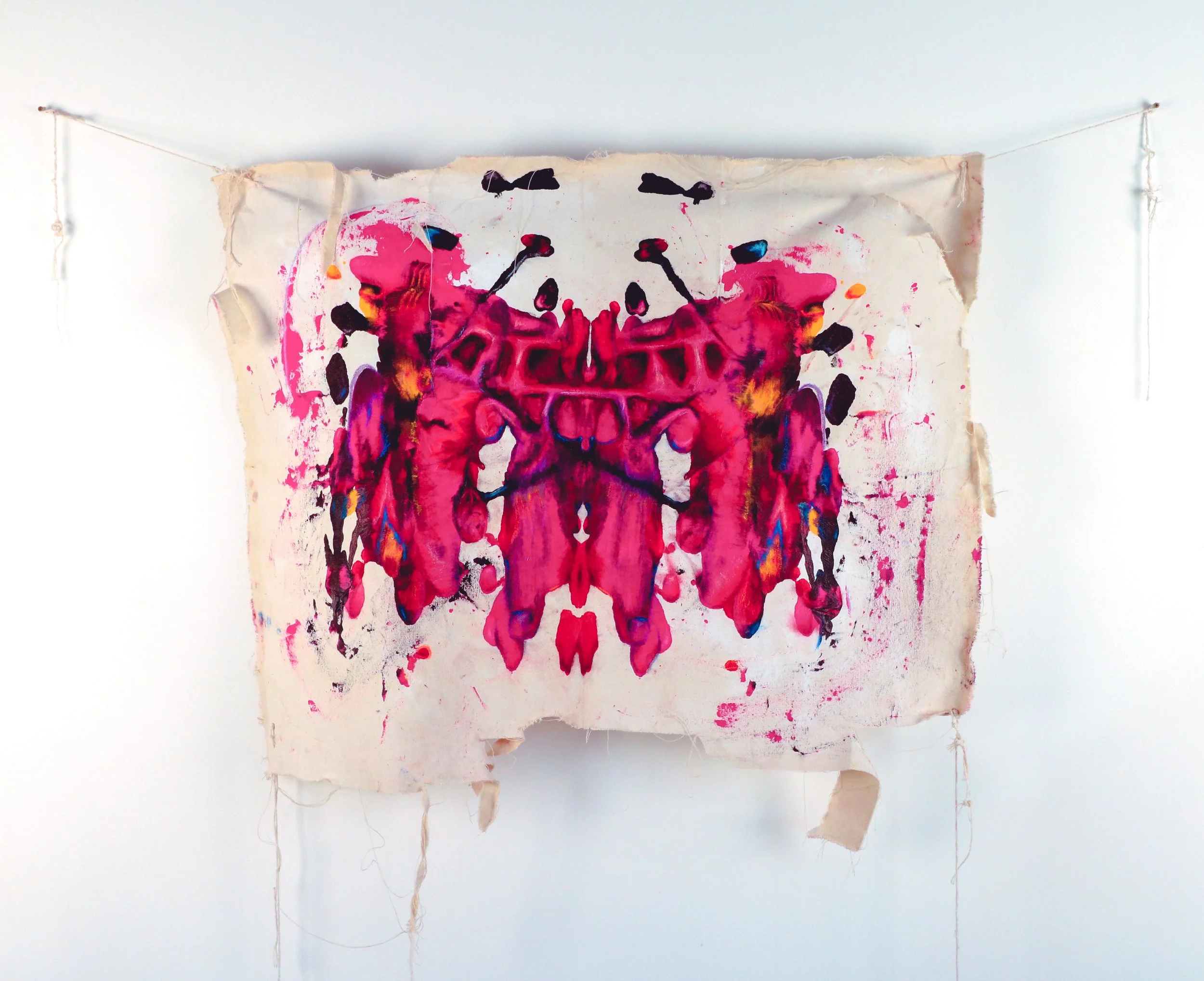 Slide 1 Slide 1 (current slide) Slide 2 Slide 2 (current slide) Slide 3 Slide 3 (current slide) Slide 4 Slide 4 (current slide) Slide 5 Slide 5 (current slide) 'Birth of Venus', 2023, acrylic and oil pastel on un-primed canvas, cotton string189cm x 87cm