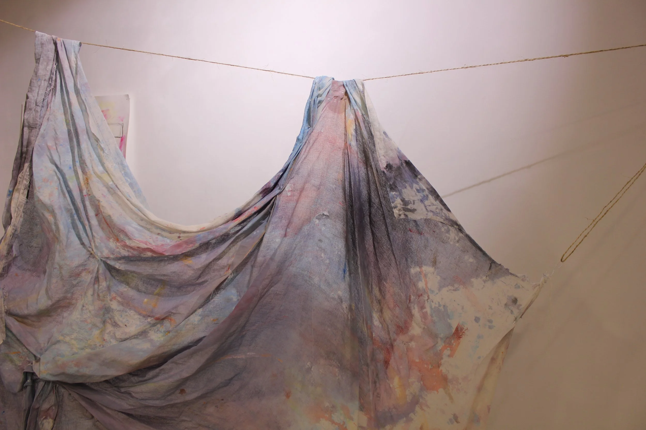 Muslin, Twine, Metal cup hooks, acrylic paint, water, thread, wire, stitching, breathe, water, flow, undoing, re doing , coffe stains, cold air, hot steam, pin pricked fingers, scrunching, plaiting, stretching, queezing, pulling, relasing, in mediation, winter sting, days that settle, deep mediation, wise penelope, clever penelope, beloved penelope, dear penelope, noble-minded penelope, fair penelope, lovely penelope, penelope the wife of noble odysseys, penelope the faithful wife, resourceful penelope, penelope with her heart full of sorrow.