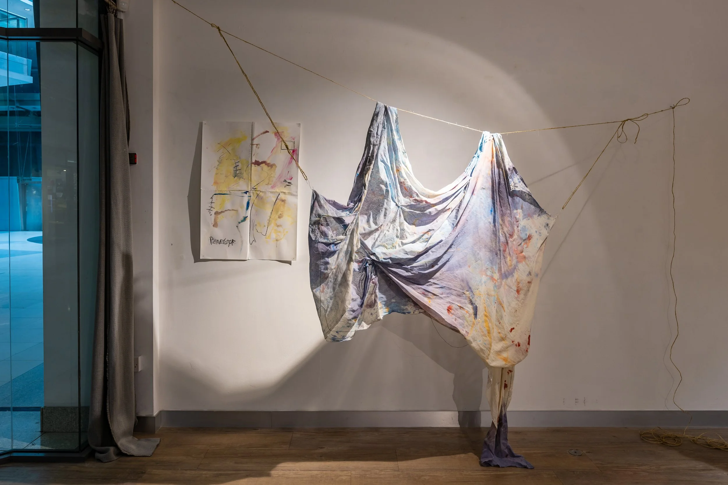‘Penelope’s Shroud’ reinterprets weaving—Penelope’s act of defiance—as a gesture of reclamation. The fabric as testament to lived experience, drapery evokes both classical depictions and ‘women’s work’. Stitching, cutting, and tension speak to containment and self-definition.