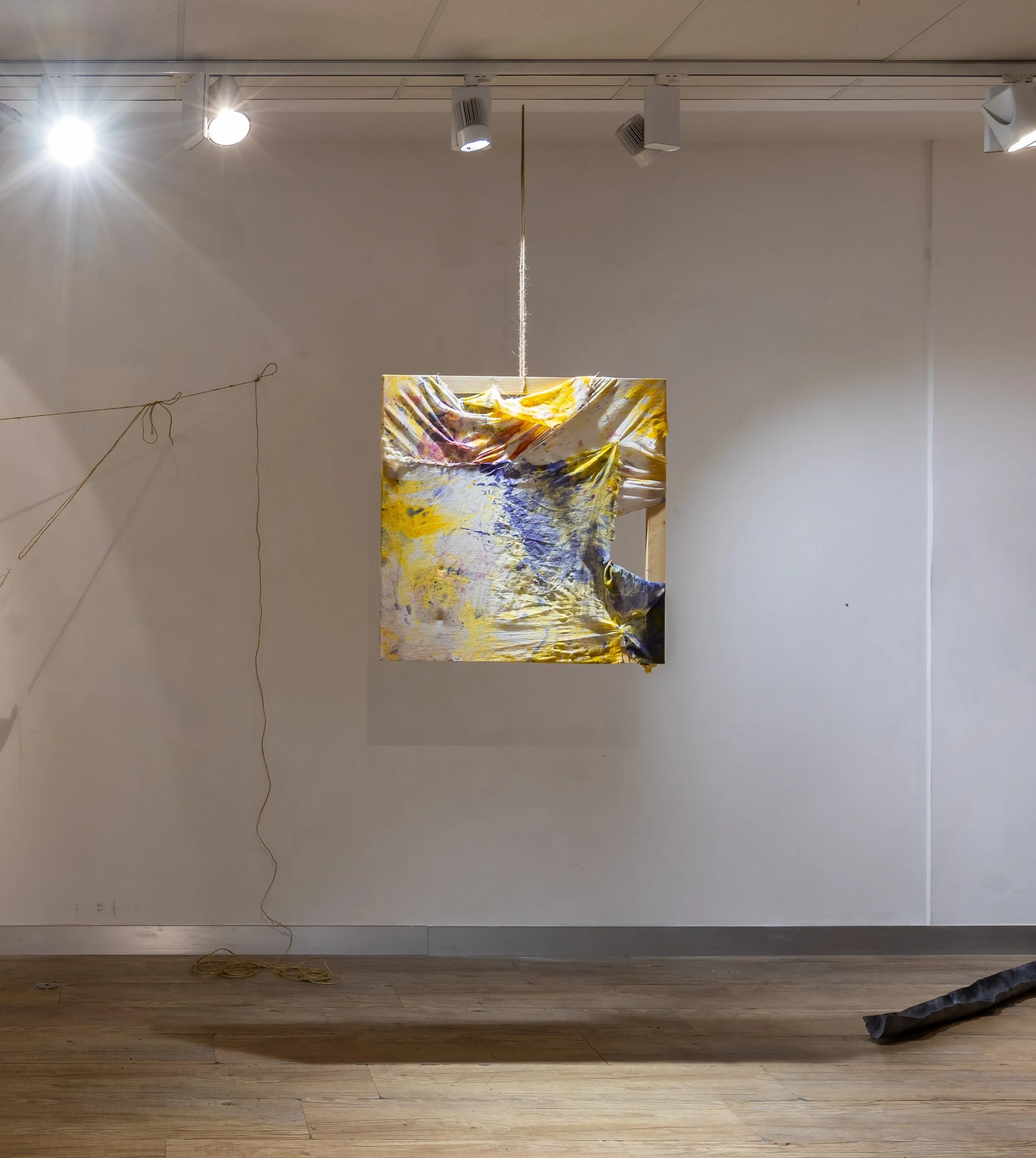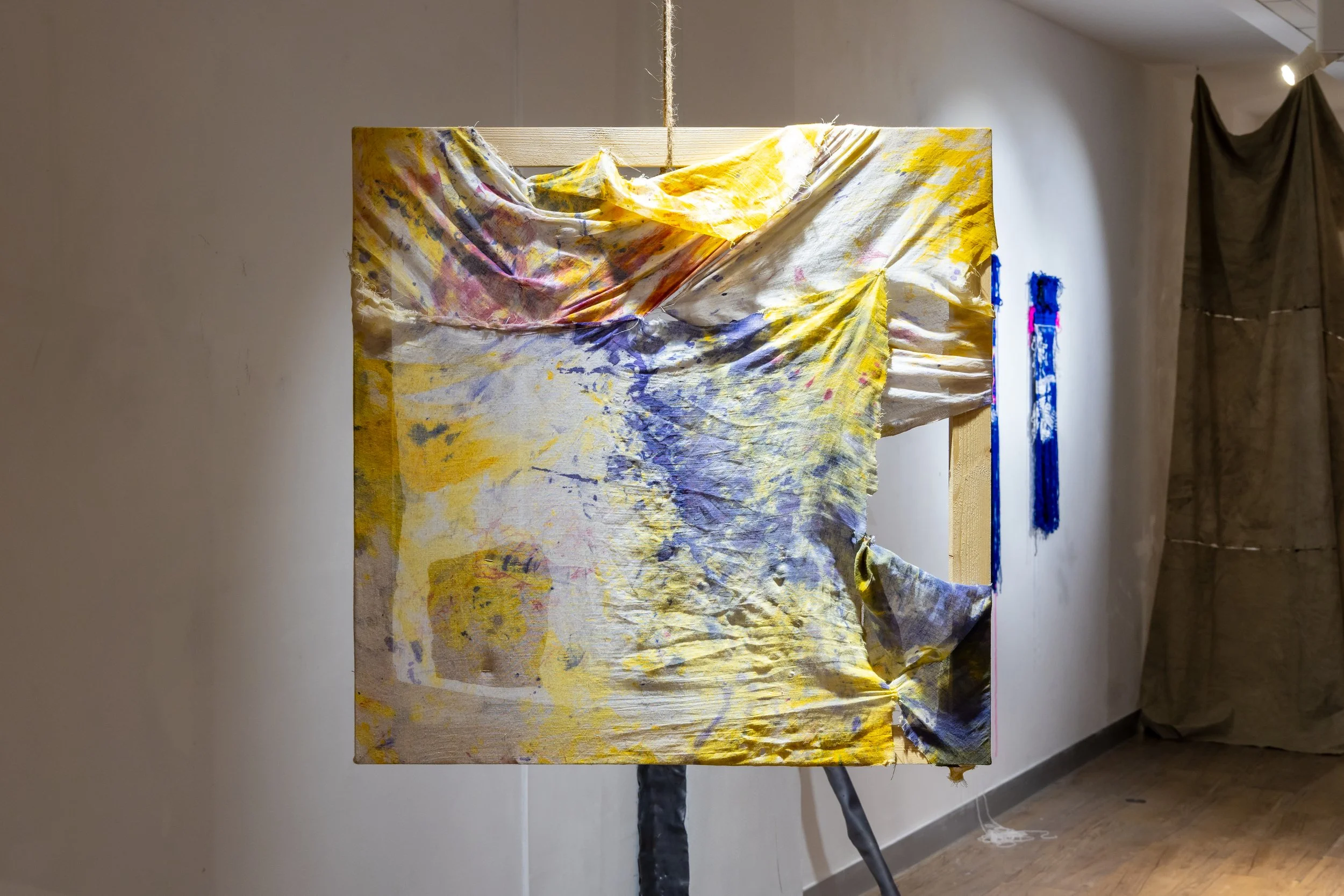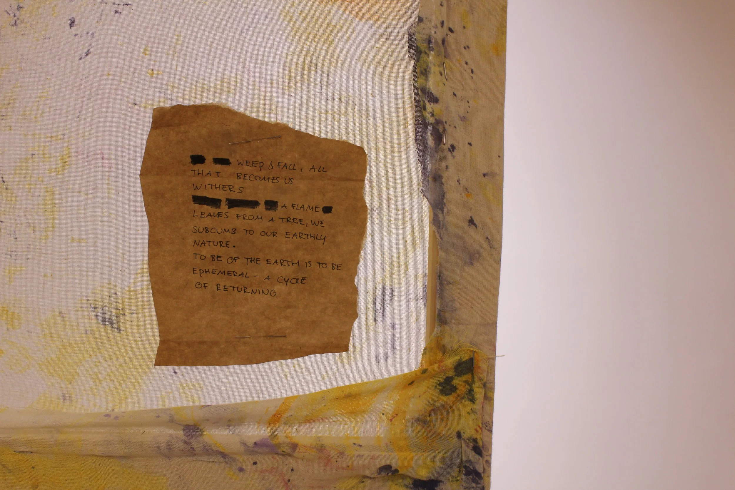 Treating fabric as fabric as flesh. Stretched, distorted, and precariously suspended, the work exposes its wooden stretcher—challenging painting’s masculine tradition. Over time, the material will slacken and decay, mirroring the body’s transience. A redacted poem pinned to the back further emphasizes erasure and vulnerability.